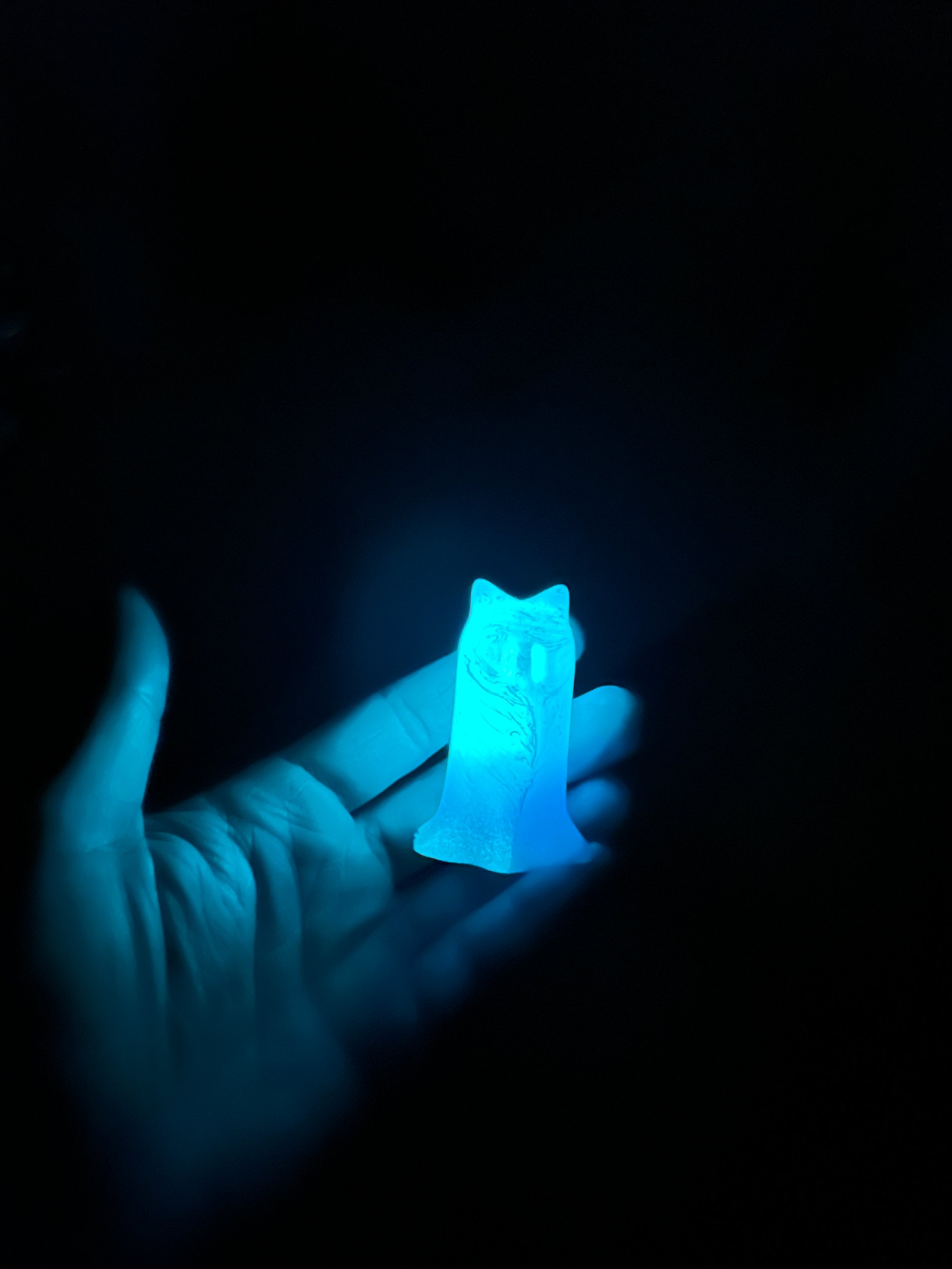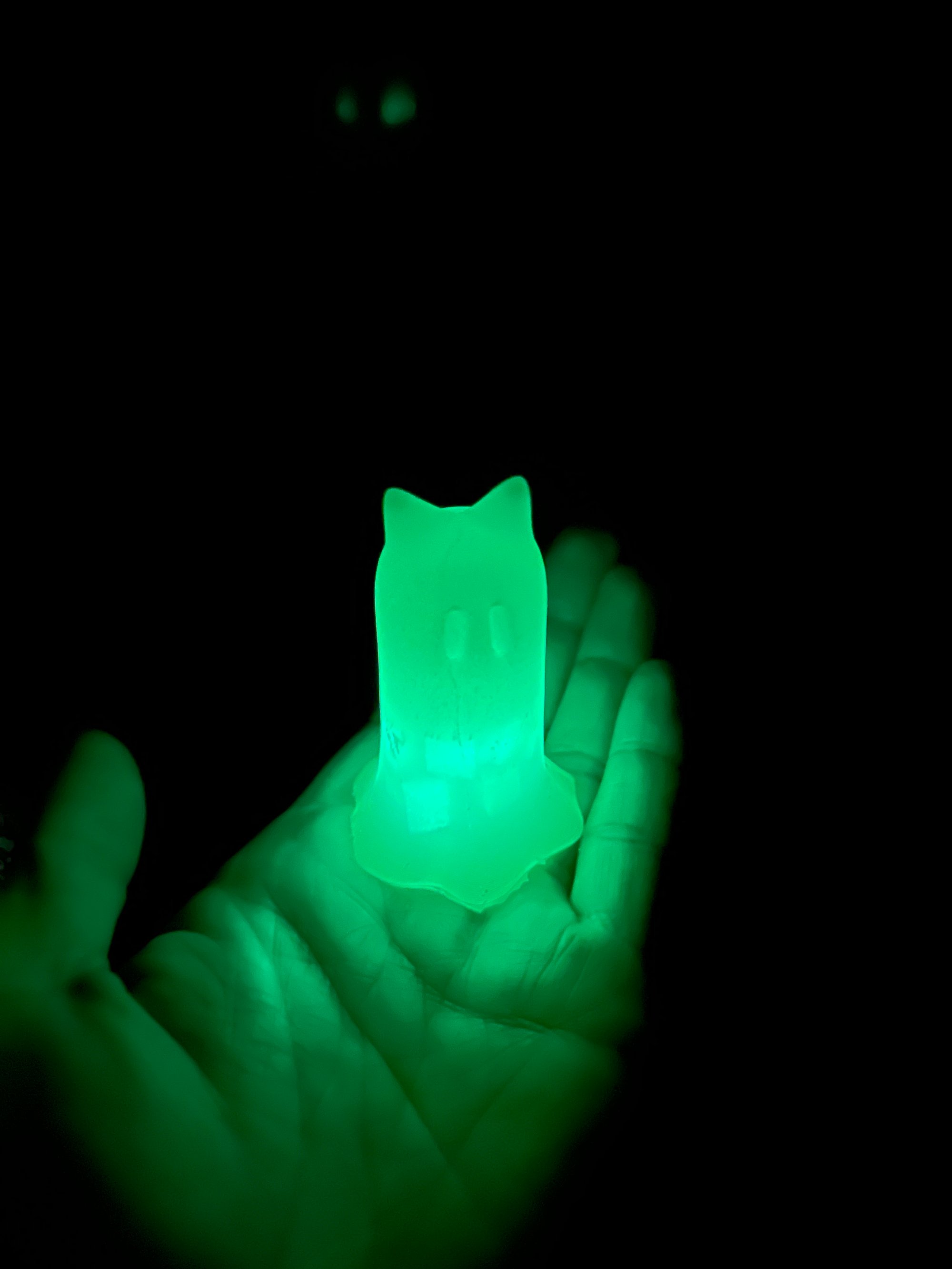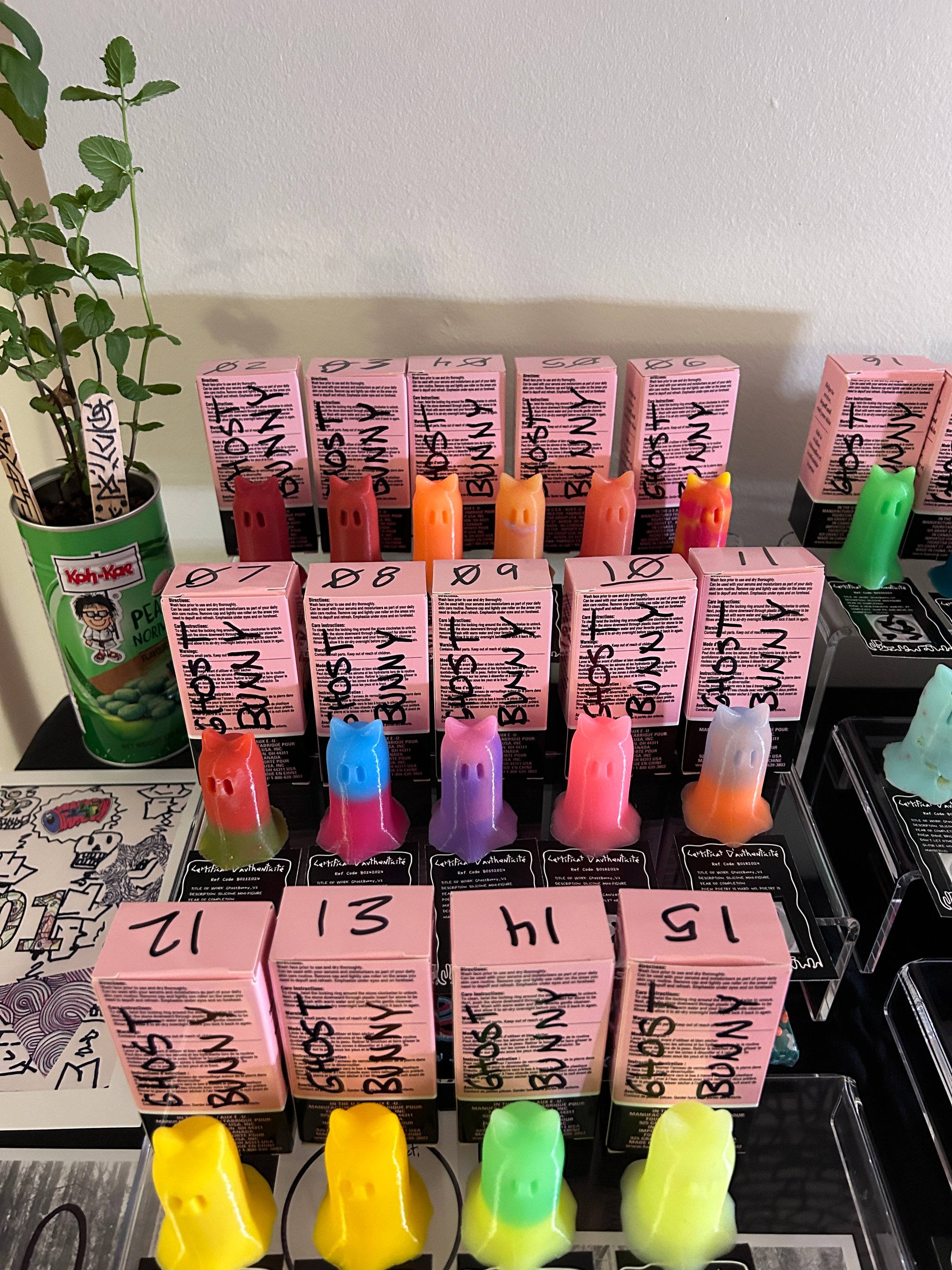 Ghost Bunny Silicone Figurine. This mold and design are the first for my Ghost Bunny character. The character, mold and material selection were independently chosen as an experiment. The mold, used to create this unique character, will be retired and the plastic recycled after the 250th figure is made.